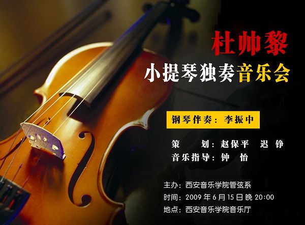 杜帅黎简介:1989年生于西安。5岁由李齐华老师启蒙学习小提琴,6岁随赵一永老师继续学习,为日后打下了较为扎实的基础。2001年考入西安音乐学院附初,师从于乌克兰外教尤金。一年后随钟怡老师学习直至2007年附中毕业。在此五年中,学习了大量的曲目,在各方面都有所提高。此外还得到解敏老师和其他老师的指导和帮助。 在校期间多次 参加校内的音乐会及省级音乐比赛,并两次获得小提琴专业少年组第一名。2005—2006年连续参加两届中国广东国际音乐夏令营,并在首届的夏令营的协奏曲比赛中获得第二名,与指挥家杨洋合作演出了《西班牙交响曲》第一乐章。2006年代表西安音乐学院参加了第八届全国小提琴比赛,在青年组中荣获优秀演奏奖。2007年6月以优异的成绩毕业于西安音乐学院附中,并同时收到了上海音乐学院与新加坡国立大学杨秀桃音乐学院的本科录取通知书。同年8月,获得全额奖学金的杜帅黎赴新加坡国立大学杨秀桃音乐学院攻读小提琴学士学位,师从于著名小提琴演奏家钱舟,继续探索小提琴的更高领域。
