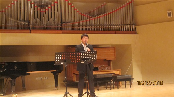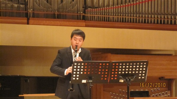 2010年12月13-18日。中国,北京中央音乐学院举办了首届国际管乐打击乐音乐节。这是2010年底中国音乐界最盛大的活动,也是中央音乐学院院庆70周年最重最精彩的一份献礼。我系青年单簧管教师,留德单簧管博士李昕应邀参加了这次音乐节。在北京中央音乐学院举办个人大师班,并于12月16日晚相约在北京单簧管专场音乐会上独奏演出俄罗斯作曲家丹尼索夫的单簧管独奏奏鸣曲。同台献艺的演奏家还有前德国巴伐利亚交响乐团单簧管首席,伊凡,马勒先生。台湾魔笛单簧管重奏组。李昕博士的演奏得到了国际同仁,北京各界音乐人士的充分肯定,音乐会取得圆满成功。