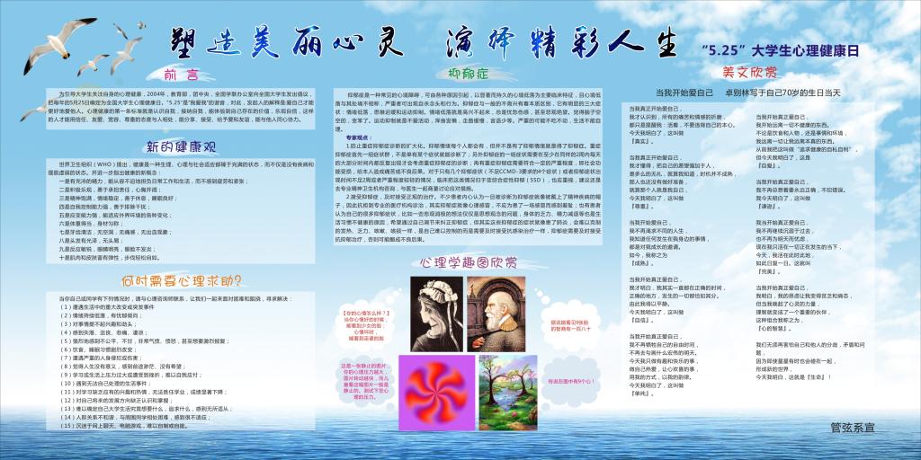 此外,为了让学生更快速直观地学习心理学知识,我系制作了“塑造美丽心灵,演绎精彩人生”为主题的宣传展板,以简单易懂的内容、图文结合的形式向学生传递心理学知识与信息。同时,辅导员和班主任开展与学生的面对面谈话。通过知心谈话,让他们敞开心扉,接受辅导员及周边同学的帮助,健康地成长与学习。