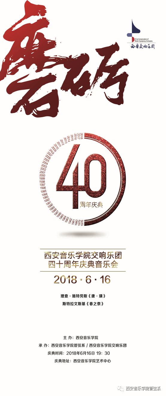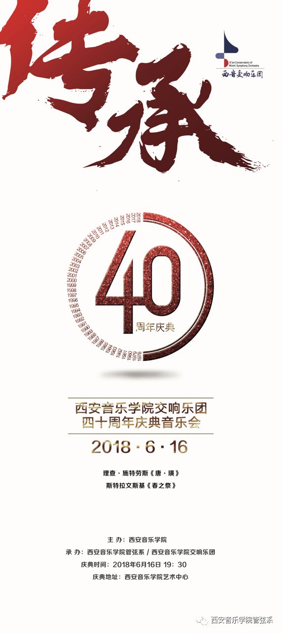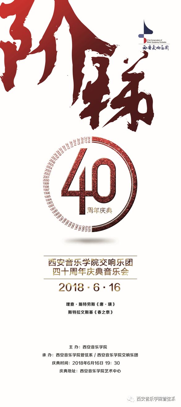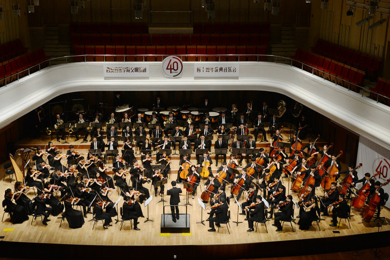 2018年6月16日,西安音乐学院交响乐团40周年庆典音乐会在我校举办。我校党委书记张立杰与中国音协名誉主席、陕西文联主席、西安音乐学院名誉院长赵季平,中国爱乐乐团首席陈允、中央音乐学院管弦系副主任童卫东、四川音乐学院管弦系主任李开祥以及我校领导和业内专家出席了庆典音乐会。