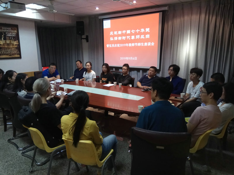 2019年9月6日,管弦系举办“庆祝新中国七十华诞弘扬新时代尊师风尚”——庆祝2019年教师节师生座谈活动,系党政、教研室负责人和老教授代表、青年教师代表、学生代表参加。