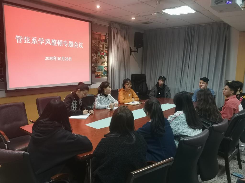 为进一步加强学风建设,增强全系学生学习的主动性和积极性,2020年10月28日晚7:00,在5号楼1821会议室开展了“管弦系学风整顿”专题会议。管弦系党总支书记、辅导员以及各年级学生干部和学生代表参加了会议。