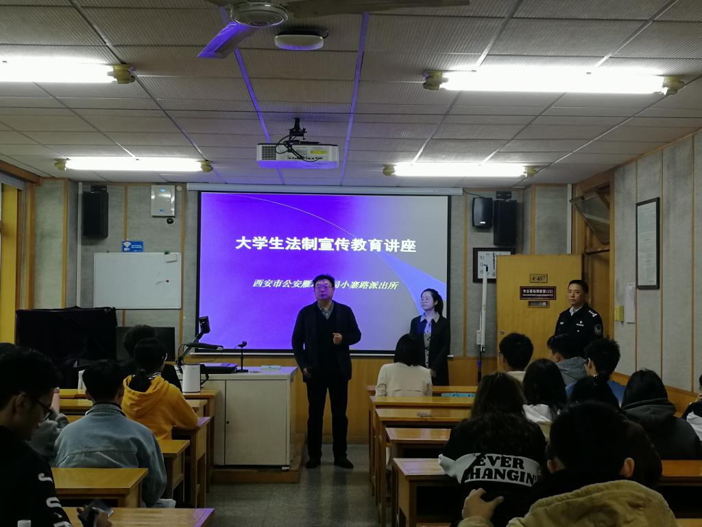 讲座上,西安市公安雁塔分局小寨路派出所徐勇军警官以《知法懂法,构建平安校园》为题,用“身边的人”,“昨天的事”告诉同学们面对诱惑要学会拒绝,面对是非要学会辨别,遭遇面前要学会机智,突发事件要学会自救。既有理论,又联系实际,尤其是注重剖析同学们的日常学习,生活和思想上存在的一些问题,使同学们了解了养成良好道德品性的重要性。徐警官还特别提醒同学们要远离潜在危险,保护人身安全,并结合近期社会及校园发生的一些违法犯罪的真实案例,来增强学生的法治观念,提高师生的安全及防范意识,讲座具有很强的针对性和实用性。