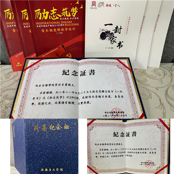 为提高青年学生的党性修养,丰富思想内涵,提升大学校园的人文精神,由管弦系党总支编制的“励志·筑梦”《音乐微党课教学设计》1-25讲和“铸魂·育人”《一封家书文集整理》1-15期被我校图书馆收藏,图书馆为管弦系党总支颁发了《珍藏纪念证》。