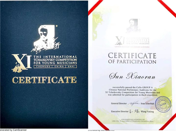 2021年5月5日,我校附中大提琴专业初三学生孙萧然成功晋级第十一届柴可夫斯基国际青少年音乐大赛国际赛。韩小鹰教授指导,历时近一个月的激烈鏖战,成为此次比赛中唯一一位晋级国际赛的地方音乐学院选手。
