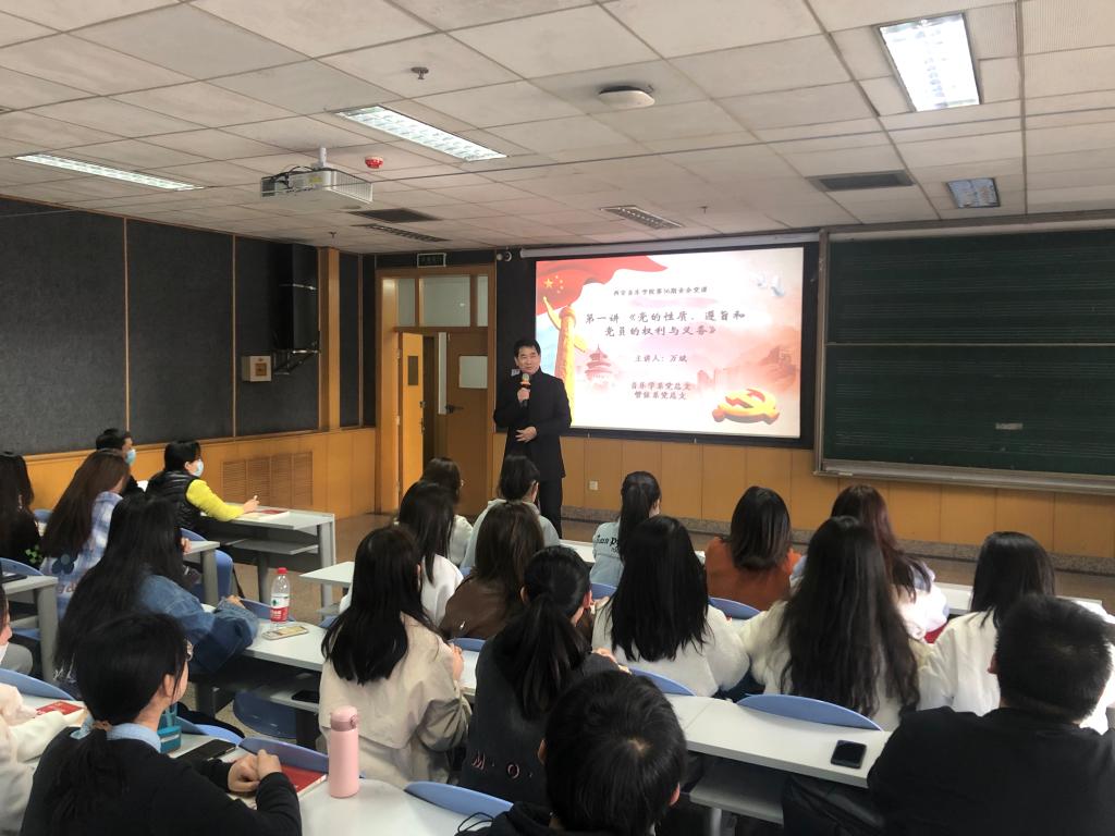 2020年11月19日星期四中午,音乐学系党总支、管弦系党总支组织开展第36期入党积极分子党课培训。培训活动由音乐学系党总支书记万斌主讲,艺术中心党支部教职工、党政办教职工、音乐学系、管弦系的50多名入党积极分子参加了学习。