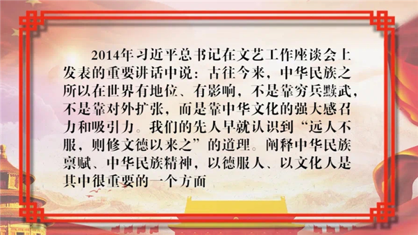 古往今来,中华民族之所以在世界有地位、有影响,不是靠穷兵黩武,不是靠对外扩张,而是靠中华文化的强大感召力和吸引力。我们的先人早就认识到“远人不服,则修文德以来之”的道理。阐释中华民族禀赋、中华民族精神,以德服人、以文化人是其中很重要的一个方面。没有优秀作品,其他事情再热闹、再花哨也只是表面文章,是不能真正深入人民精神世界的,是不能触及人的灵魂、引起人民思想共鸣的。