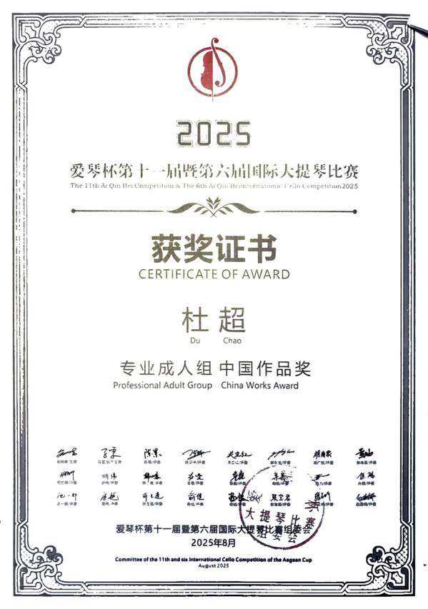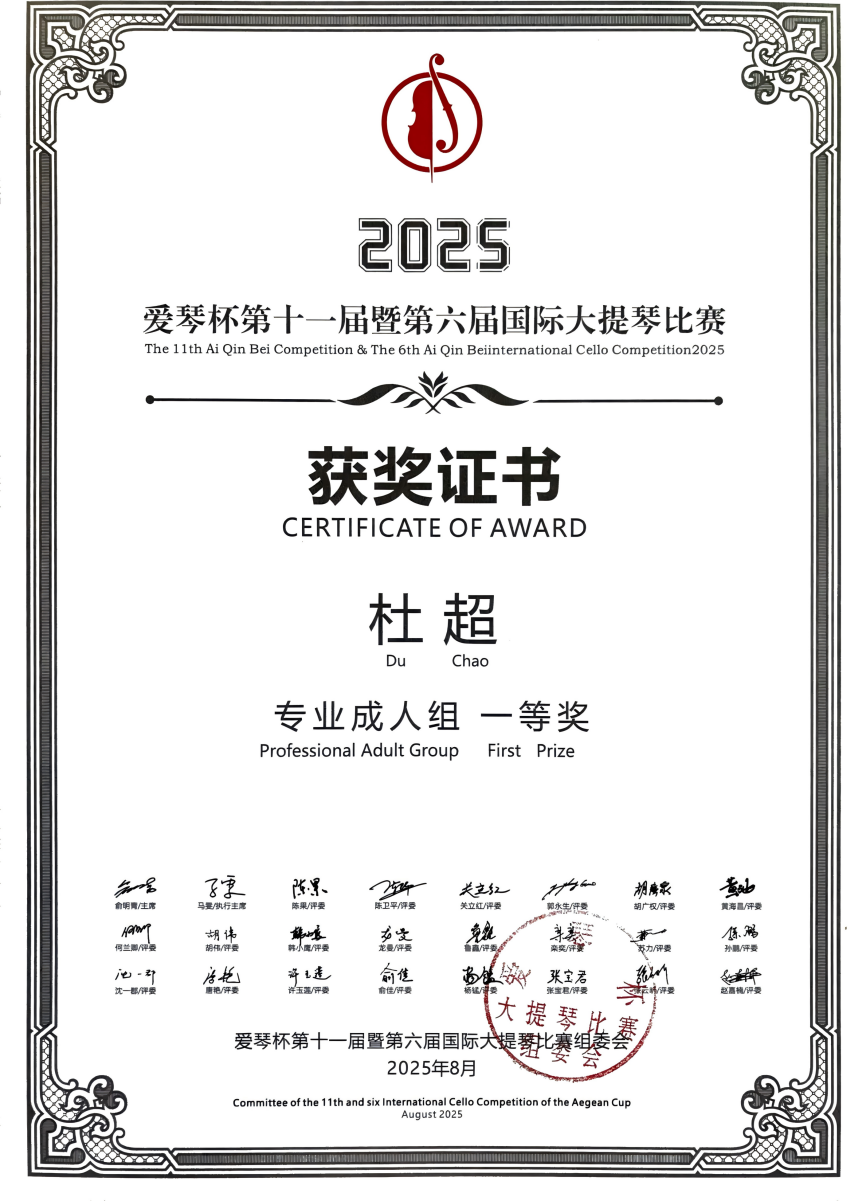 近期,我校管弦系大提琴青年教师杜超在 2025 年“爱琴杯”第十一届暨第六届国际大提琴比赛中表现突出,斩获专业成人组一等奖与最佳中国作品奖双项荣誉。