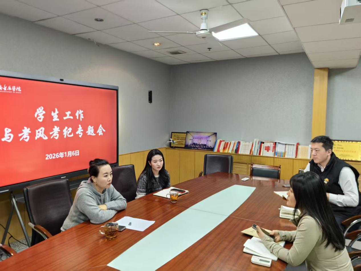 1月6日下午,管弦系于会议室召开学生工作与考风考纪专题会,系分党委书记王文霞、分党委副书记焦豫丹,系学生党支部书记王佳艺、辅导员组长张华及辅导员王晨年参会。会议旨在夯实学生日常管理,严明期末考风考纪,推动育人工作提质增效。