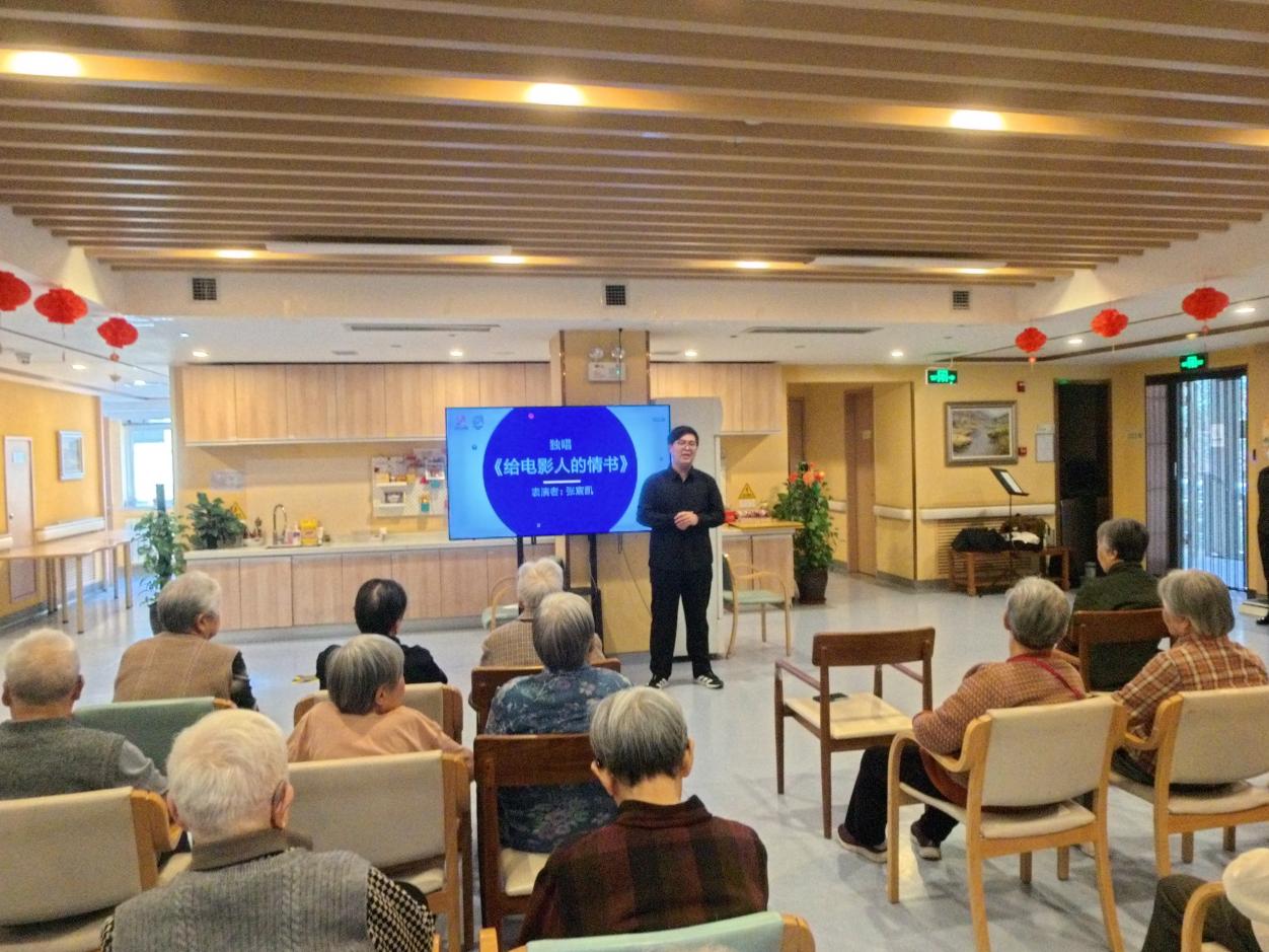本次美育微课堂慰问演出由赵君缘主持并温情启幕,现场布置简洁温馨,老人们围坐整齐、满怀期待。整场微课堂以“中西旋律交融、经典美育浸润” 为核心,每一个节目都是精心设计的美育内容,用老少皆宜的艺术形式,让老人们近距离感受音乐之美。