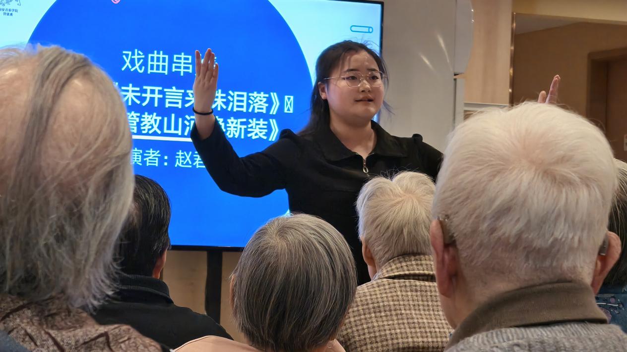 主持人赵君缘率先开启美育第一讲,带来秦腔《未开言来珠泪落》和京剧《管教山河换新装》经典选段联唱。婉转悠扬的秦腔饱含传统戏曲韵味,铿锵有力的京剧尽显国粹魅力,一唱一和间尽显中华传统艺术之美,瞬间点燃现场氛围,老人们听得入神,掌声接连不断。